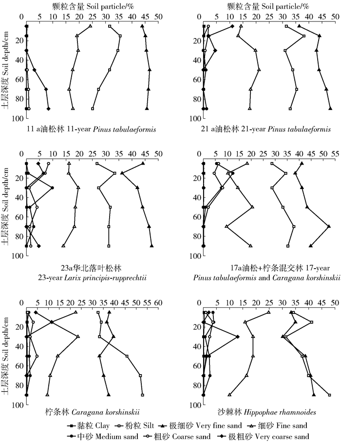 2) 6种林地0~100 cm深度土壤粒度组成以极细砂和粉粒为主。7个粒级中,柠条林和沙棘林粉粒占比最大,其他林地极细砂含量占比最大;不同林地类型在0~100 cm深度土壤平均粒径由大到小依次为:23 a华北落叶松林>11 a油松林>21 a油松林>17 a油松+柠条混交林>沙棘林>柠条林。