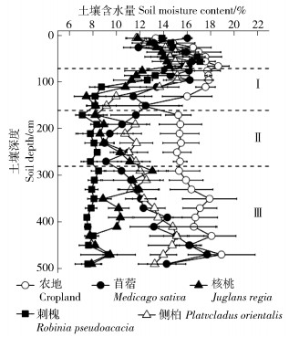 图 1 不同人工植被类型垂直剖面上土壤含水量分布(n=3) Fig. 1 Profile distribution of soil moisture content for different artificial vegetation types in the study region (n=3) |