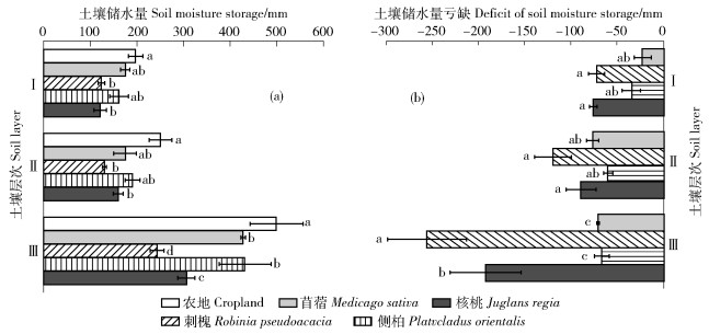 在深层不同层次中5种人工植被类型间的土壤储水量均有显著性差异(P < 0.05,图 2a)。在Ⅰ和Ⅱ层,农地土壤储水量显著高于刺槐和核桃(P < 0.05);在Ⅲ层,农地显著高于苜蓿和侧柏(P < 0.05),核桃次之,刺槐最低。以农地为对照,计算各样地不同深层层次土壤储水量的亏缺量(图 2b),苜蓿、刺槐、侧柏和核桃的亏缺量分别为:Ⅰ层:-22.47 mm、-72.81 mm、-34.85 mm、-76.30 mm;Ⅱ层:-76.99 mm、-119.66 mm、-59.88 mm、-89.34 mm;Ⅲ层:-71.37 mm、-255.78 mm、-67.20 mm、-191.96 mm。总体来说,刺槐和核桃的亏缺量最大,且在深层尤为显著,苜蓿和侧柏次之。