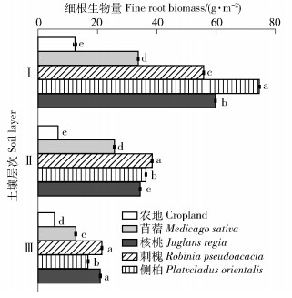 在不同深层层次中5种人工植被类型间平均深层细根生物量(以10 cm深度计)存在显著性差异(P < 0.05),且表现出随着土壤深度增加而逐渐降低的趋势(图 3)。5种人工植被类型深层(70~500 cm)细根生物量约占0~500 cm总土层深度的37%,深层平均细根生物量表现为:侧柏(2.9 g/m2)>刺槐(2.68 g/m2)>核桃(2.67 g/m2)>苜蓿(1.67 g/m2)>农地(0.56 g/m2)。平均细根生物量在Ⅰ层表现为:侧柏>核桃>刺槐>苜蓿>农地;在Ⅱ层表现为:刺槐>侧柏>核桃>苜蓿>农地;在Ⅲ层表现为:刺槐>核桃>侧柏>苜蓿>农地。