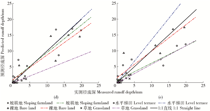 在SCS-CNLes模型验证期内,坡耕地和草地小区线性拟合线则位于1:1直线下方,实测值和预测值所对应的点(Qoi, Qmi)也较多的分布于1:1直线下方,表明在总体上两个小区径流预测值要小于实测值;水平梯田小区线性拟合线位于1:1直线上方,表明在总体预测效果上预测值要大于实测值,模型合格率为85.72%,NSE=0.32,RMSE=1.31;裸地小区线性拟合线与1:1直线相交于点(9.40, 9.40)处,线性方程斜率为0.87<1,截距为1.56>1,表明对于实测径流深在0~9.4mm的径流事件,SCS-CNLes模型在裸地小区中的预测值要大于实测值,而当实测径流深大于9.4mm时,预测值小于实测值。