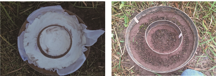 图 1 表置式环式入渗仪基质入渗(左)和总入渗(右)安装实物图 Fig. 1 Installation physical object of surface ring infiltration meters for measuring matrix (left) and total (right) infiltration |