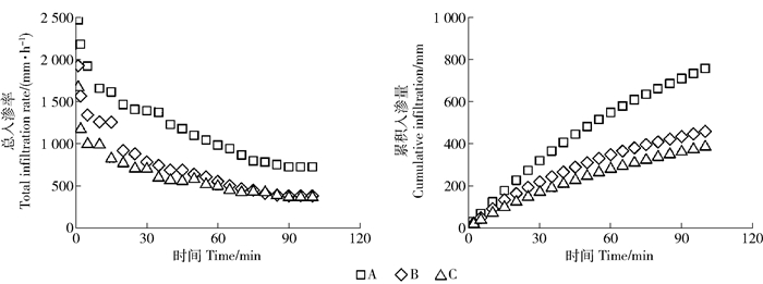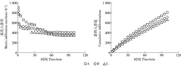 A, B, and C are the 3 experimental sites.The same below. 图 2 不同试验点土壤基质入渗率和累积入渗量随时间变化情况 Fig. 2 Soil matrix infiltration rate and cumulative infiltration at different experimental sites |
