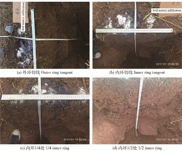 优先流通道可通过染色示踪来刻画,亮蓝被认为是现在试验中最理想的染色示踪剂,对于没有大孔隙的土壤,亮蓝只能停留在土壤表面或进入基质0.5~1 mm的深度[16]。土壤剖切面处无染色区域,即可说明无优先流通过。土壤水平切面和垂直剖面如图 3和图 4所示,均无染色部分,表明没有优先流经过,所测得的入渗过程确为基质入渗。