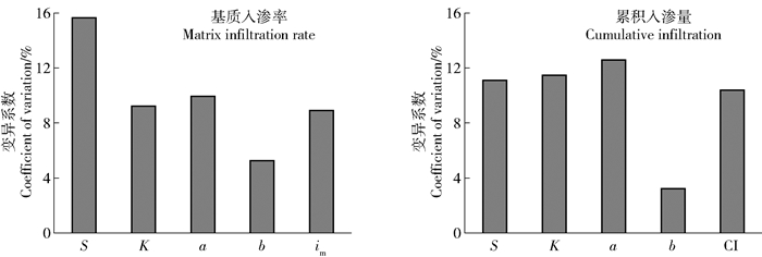 图 5 基质入渗不同参数的空间变异性 Fig. 5 Coefficients of variation of parameters S, K, a, b, im and cumulative infiltration (CI) |