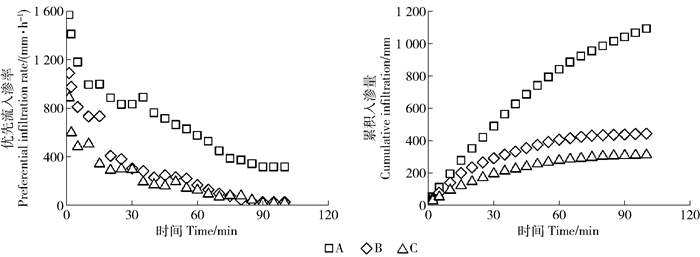 用土壤总入渗扣除基质入渗计算得到土壤大孔隙优先流,优先流试验点(A、B、C)的土壤入渗率和累积入渗量如图 9所示,土壤优先流初渗速率介于504.0~1 570.8 mm/h之间,稳渗速率介于18.0~316.8 mm/h之间,土壤平均入渗率介于231.3~725.8 mm/h之间,累积入渗量介于309.0~1 092.7 mm之间。优先流的初渗速率(504.0~1 570.8 mm/h)和累积入渗量(309.0~1 092.7 mm)显示了显著的空间变异性,这种空间变异可能归因于大孔隙的空间随机性,因为大孔隙的空间分布特征在相似植被类型之间也存在显著差异[20]。