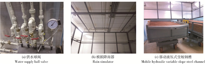 2.2 试验设计本试验于2018年7—9月在西南大学资源环境学院模拟降雨试验室进行,包括双环入渗试验和人工模拟降雨试验。试验共设计3种降雨强度(0.38、0.75和1.10 mm/min)和4种坡度(5°、10°、15°和20°),每场试验做3个平行。采用人工模拟降雨装置,下喷式喷头距试验坡面2 m,由计算机控制降雨强度与降雨历时,降雨强度变化范围0.20~2.23 mm/min。试验土槽选择长×宽×高=2 m×1 m×0.5 m的可变坡式钢槽,土槽底部密封,坡面无植被覆盖,试验土槽表面自带V型集流槽,坡度调节范围5°~20°。填装土槽时,在土槽底部依次填充细砂5 cm、纱布1层以保证土壤透水性,再按5 cm 1层分层填装土样,边填充边压实,保证土壤密度在1.35 g/cm3左右,土样填装厚度30 cm。试验装置如图 1所示。