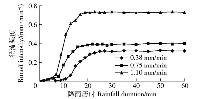 3.2 降雨强度、坡度对坡面产流和入渗的影响 3.2.1 坡面径流强度随降雨历时的变化由图 2可知,一定坡度(采用三峡库区坡耕地较常见的坡度15°)下,径流强度随降雨历时逐渐增大,3种降雨强度下的曲线变化趋势基本一致。降雨开始后,坡面并未立即产生径流,开始产生径流的几分钟内,其增幅较小,随着降雨持续进行,径流强度迅速增加,随后趋于稳定。降雨强度1.10 mm/min时,在径流产生后4~12 min,坡面径流强度由0.04快速上升至0.61 mm/min,产流后12~18 min,径流强度由0.61缓慢上升至0.73 mm/min后趋于稳定;降雨强度0.75 mm/min时,在径流产生后4~14 min,径流强度快速上升至0.36 mm/min,产流后14~20 min,径流强度缓慢上升至稳定值0.39 mm/min;降雨强度0.38 mm/min时,在径流产生后4~14 min,径流强度快速上升,产流后14~18 min,径流强度上升缓慢,18 min之后,径流强度在0.32 mm/min上下波动。