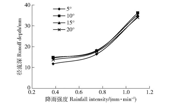 一定降雨强度下,径流深受坡度变化的影响较复杂。一方面,随着坡度的增大,坡面水层压力沿坡面的垂向分力减小,坡向分力增大,从而加速水流沿坡面运动,减少水流下渗,使径流深增加;另一方面,随着坡度的增加,坡面承雨面积也相应减少,影响坡面径流量。由此可见,可能存在一个临界坡度使2方面对径流深的影响抵消。王先拓等[17]研究表明该坡度在10°~15°之间,本试验亦有同样的结果。坡度一定时,径流深与降雨强度呈正相关,两者间的关系可用幂函数进行表述,这与马星等[18]研究结果一致,但其研究发现随坡度的增大,降雨强度对径流深的影响程度也增大,而笔者发现随坡度的增大,各坡度下径流深随降雨强度变化的曲线几乎重叠。这可能是由于两者的试验设计条件不同以及受到试验操作等的影响,导致研究结果存在差异性,对此还需通过更多的野外试验和室内模拟做进一步的研究和验证。