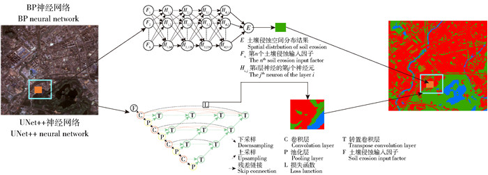 3.2 模型精度分析采用BP神经网络和UNet++神经网络对研究区进行试验,用式(3)总体精度(overall accuracy)作为指标对土壤侵蚀空间分布结果进行评价。表 2评价结果显示,UNet++神经网络总体精度为95.7%,BP神经网络总体精度91.4%,均超过90%,说明深度学习模型都能较好反映真实土壤侵蚀空间分布状况;UNet++神经网络精度比BP神经网络高4.3%,在评价精度上表现更为优越。