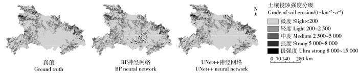 获取侵蚀空间分布(图 3),根据SL190—2007《土壤侵蚀分类分级标准》,统计结果中各级土壤侵蚀强度像元数、面积(表 3),结果表明:1)2种模型计算所得土壤侵蚀空间分布结果在空间格局上与真实数据具有一致性;2)2种方法得到的土壤侵蚀空间分布结果均未出现明显区块化特征,未呈现与单一因子空间分布趋势一致性过高的现象;3)BP神经网络结果中,中部微度侵蚀集中区域呈现大量点状分布的极强度侵蚀像元“椒盐”现象;UNet++神经网络结果中未出现明显“椒盐”现象;4)BP神经网络和UNet++神经网络结果中各级土壤侵蚀强度面积的构成与真实数据接近。