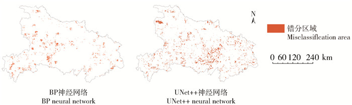 UNet++神经网络结果中,微度、轻度、中度、强度和极强度侵蚀面积误差分别为-0.55%、12.51%、-5.58%、-19.61%和6.38%。轻度侵蚀误差较大,错分像元主要分布在微度、轻度和强度侵蚀交织处,区域内轻度侵蚀比例大,模型训练该类像元窗口时,易将微度和中度侵蚀错分为轻度侵蚀。强度侵蚀面积误差较大主要是由于比例仅3.99%,样本数量少。极强度侵蚀比例更小,却与BP神经网络一样出现误差,是由于该类型侵蚀集中分布,且UNet++神经网络以像元窗口的形式输入,对集中分布的侵蚀类型有较好的识别能力。