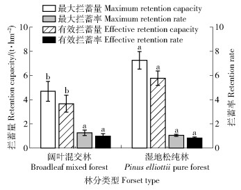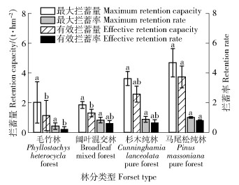 由图 1可见,有效拦蓄量表现为马尾松纯林(3.73 t/hm2)显著大于阔叶混交林(1.31 t/hm2)、竹林(1.14 t/hm2)(P < 0.05);有效拦蓄率呈现马尾松纯林显著高于毛竹林;但是,在粗质砂土类型中不同林分的最大拦蓄量、最大拦蓄率没有显著差异,但针叶林与阔叶混交林、毛竹林形成2个层次等级。