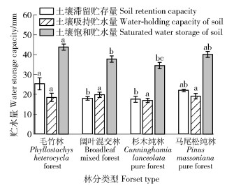 在粗砂质地区,毛竹林的平均土壤水分最大滞留贮存量最大(25.27 mm),显著高于阔叶混交林与杉木纯林(17.97与17.51 mm);土壤最大吸持贮水量在不同林分间无显著差异(P>0.05);土壤饱和贮水量表现为毛竹林(43.75 mm)大于阔叶混交林、杉木纯林,马尾松纯林(40.06 mm)大于杉木林(P < 0.05)(图 2)。