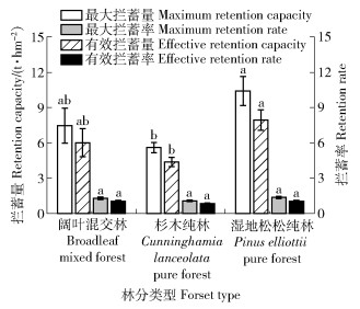 5 结论1) 针叶纯林的枯落物层将具有更高的水文功能效应,混交林次之,阔叶纯林居末。