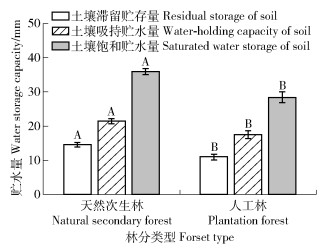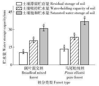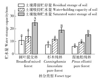江西省粉土质地区内,不同林分间的土壤水分最大滞留贮存量、土壤最大吸持贮水量不存在显著性差别(图 4)。但土壤水分饱和贮水量阔叶混交林(24.82 mm)极显著高于杉木纯林、湿地松纯林(P < 0.01)。