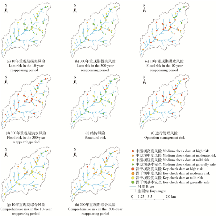 笔者从损失、结构、洪水和运行管理4个方面建立一套完整的淤地坝风险评价体系,综合分析韭园沟流域淤地坝系的溃决风险,整体上实现流域坝系的系统性风险评价。加强淤地坝运行风险预警研究,建立淤地坝风险预警体系标准,促进黄河流域高质量发展[14-15],已经成为新时代黄土高原淤地坝建设和水土保持生态建设的急切需求。研究结果可为量化淤地坝溃决造成的损失风险和综合评价淤地坝运行风险提供科学依据。