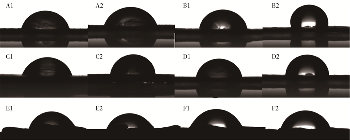 1:正面;2:反面;A:金叶女贞;B:冬青卫矛;C:小叶黄杨;D: 红叶石楠;E:龙柏;F:侧柏。 1: Front. 2: Back. A: Ligustrum×vicaryi. B: Euonymus japonicus. C: Buxus sinica var. parvifolia. D: Photinia×fraseri. E: Juniperus chinensis. F: Platycladus orientalis. 图 3 6种灌木叶片正反面接触角 Fig. 3 Front and back contact angles of 6 shrub species |