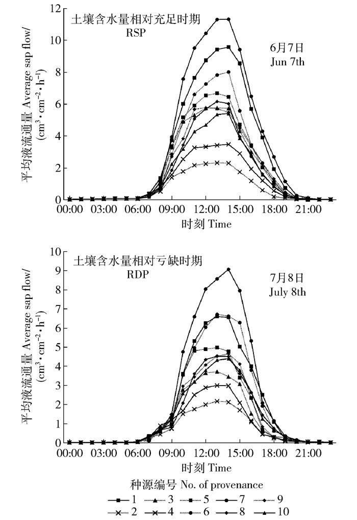 如图 2所示,在2个时期中,不同种源杉木的液流启动时间均为07:00左右,在13:00—14:00达到峰值,随后逐步下降,20:00后逐渐趋于稳定,总体表现为昼高夜低。从日变化曲线中可见不同种源之间的液流密度差异较明显,7号种源在2个时期的液流密度峰值最高,在RSP的液流密度峰值为11.32 cm3/(cm2 ·h)比RDP的9.04 cm3/(cm2 ·h)高25.22%,2号种源在2个时期的液流密度峰值最低,在RSP的液流密度峰值为2.32 cm3/(cm2 ·h)比RDP的2.17 cm3/(cm2 ·h)高6.91%。在RSP,液流密度峰值由大到小的顺序为:7号>1号>6号>5号>8号>3号>9号>10号>4号>2号,在RDP,液流密度峰值由大到小的顺序为7号>1号>6号>5号>8号>9号>10号>3号>4号>2号,各个种源从RSP到RDP液流密度峰值的降幅排序为3号>1号>8号>5号>7号>9号>10号>6号>4号>2号,说明2号种源在土壤缺水环境适应能力较强。