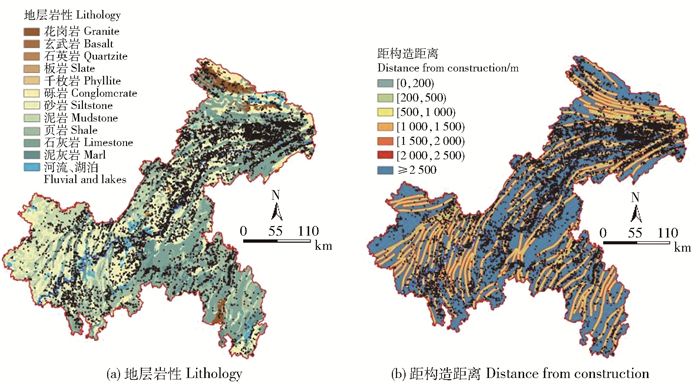 地层岩性属于离散型变量,直接将类型划分为12个等级。重庆市主要以砂岩、石灰岩、泥岩、页岩为主,其次为泥灰岩、砾岩、花岗岩,局部分布有千枚岩、板岩、玄武岩(图 3a)。不同类型的岩石物理力学特性存在较大差异[15],例如泥岩、页岩、板岩、千枚岩的岩性差,所构成的斜坡易风化产生泥化矿物,致使坡体结构面抗剪强度降低,破坏坡体稳定性。重庆市的砂岩、泥岩主要分布在西北部,石灰岩、页岩主要分布在东北部和南部。其中,91.53%的滑坡发生在砂岩、泥岩、页岩、石灰岩4个岩层上,但板岩的信息量值最大,表明重庆市板岩分布少,但只要板岩存在的区域发生滑坡的概率最大。距构造距离属于连续型变量,基于ArcGIS的多环缓冲功能将距离分为7个等级,地质构造通过影响坡体内部软弱结构面的发展与演化间接影响斜坡稳定。据图 3b和表 2可知,48.20%的滑坡发生在距构造2 500 m的范围之外,但其信息量值最小。距构造距离[500 m, 1 000 m)区间的信息量值最大,表明在距构造[500 m, 1 000 m)范围内最易发生滑坡。