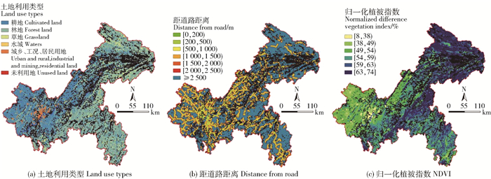 3.4 人类活动因子土地利用类型属于离散型变量,直接将类型划分为6个等级。土地利用会影响水土流失、降雨入渗、地表结构特征,不合理的土地利用加速滑坡发育。据图 5a和表 2可知,重庆市的土地利用主要以耕地和林地为主,分别占45.48%和40.76%;耕地主要分布在西北部和西南部,林地主要分布在东北和东南部。其中,84.43%的滑坡发生在耕地和林地上,两者的信息量值分别为0.159和-0.270,耕地更易诱发滑坡发生。距道路距离属于连续型变量,基于ArcGIS的多环缓冲功能将距道路距离分为7个等级。道路建设破坏了原有的自然地质条件,破坏坡体自身平衡状态。据图 5b和表 2可知,50.54%的滑坡发生在距道路2 500 m范围之外,但其信息量值最小;[0, 200 m)的信息量值最大,表明在距道路200 m范围之内最易发生滑坡。NDVI属于连续型变量,依据自然断点法将NDVI分为6个等级,植被的护坡作用通过力学机制、水文机制发挥作用。重庆市的NDVI分布在[8%, 74%]之间,主要呈现东北高、西北低的走势(图 5c)。NDVI为[8%, 38%)时,信息量值最大,表明植被覆盖较少的地方更易发生滑坡灾害。
