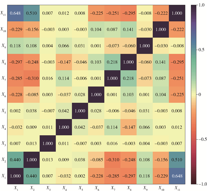 X1 ~ X11依次为高程、坡度、坡向、地层岩性、距构造距离、距水系距离、月均降雨量、土壤类型、土地利用、距道路距离、归一化植被指数。下同。 X1: Elevation. X2: Slope. X3: Aspect. X4: Lithology.X5: Distance from construction. X6: Distance from water system. X7: Average monthly rainfall. X8: Soil types. X9: Land use types. X10: Distance from road. X11: Normalized difference vegetation index, NDVI. The same below. 图 6 评价指标之间的相关性 Fig. 6 Correlations among different evaluation indicators |