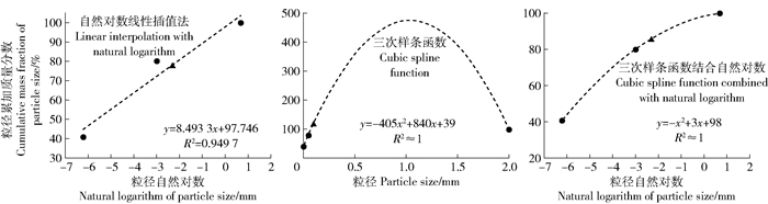 2 结果与分析 2.1 土壤质地插值转换插值获得诺模图计算所需极细砂的质量分数,以江西省关山系样点为例,使用3种插值方法得到粒径质量分数结果如表 1所示。其中,自然对数线性插值法拟合精度较差,获得的 < 0.100 mm粒径质量分数低于 < 0.050 mm粒径,导致极细砂质量分数为负值;三次样条函数法受样本数量过少(n=3)的影响,获得的累加极细砂粒径(< 0.100 mm)质量分数高于100%,明显不合理;三次样条函数结合自然对数法克服了函数分布不合理的缺点,以高精度方程拟合了不同土壤粒径的质量分数(R2≈1),同时避免了质量分数高于100%的情况(图 1)。