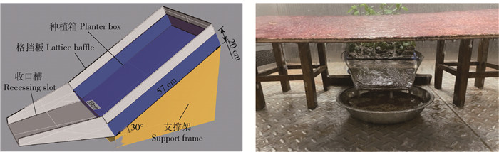 2.2 冲刷试验利用人工气候模拟系统环境箱(型号CABR-MCB)模拟降雨冲刷。设置平均降雨强度28.16 mm/h,时长1 h,降雨均匀系数k=0.89,降雨高度2 m,待雨量稳定后开始试验。自主设计径流收集装置,由格挡板,收口槽和支撑架组成(图 1)。每5 min收集1次径流,每组试验重复3次。