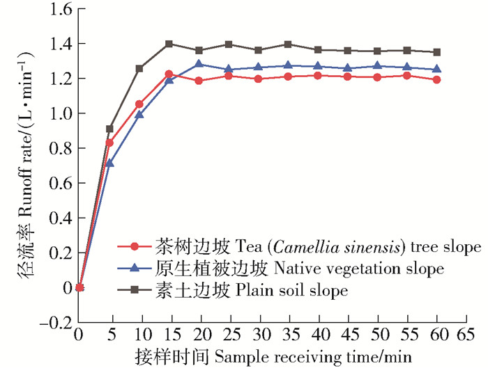 3 结果与分析 3.1 茶树种植对边坡抗冲性能的影响根据冲刷试验计算径流率和抗冲系数。径流率反映降雨转化为径流的效率;抗冲系数反映每冲刷1 g干土所需的径流量,公式如下:
