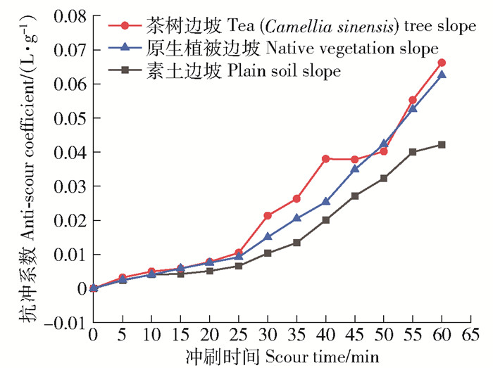 由图 3看出,抗冲系数呈增大趋势,前期增幅较缓,后期变大。抗冲系数最大值表现为:茶树边坡(0.066 22 L/g)>原生植被边坡(0.062 50 L/g)>素土边坡(0.042 19 L/g)。经计算,茶树边坡平均抗冲系数(0.026 5 L/g)比原生植被边坡(0.023 5 L/g)提高12.8%,比素土边坡(0.017 3 L/g)提高53.2%。