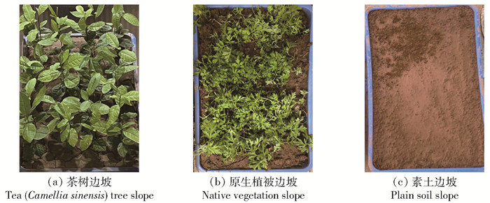 2 材料与方法 2.1 试验设计为还原茶场植被生长条件,模型土壤采自茶场,土壤物理性质见表 1。边坡采用种植箱(长57 cm,宽39 cm,高20 cm)模拟,分别搭建茶树边坡、原生植被边坡和素土边坡,坡度30°。