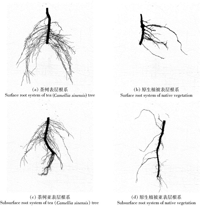 根系发育情况通过根长、根表面积、分形维数等指标体现。分形扫描见图 5,发育情况指标见表 2。可见,茶树根系比原生植被根系扩散幅度广,复杂程度高;且茶树根系各项指标均大于原生植被,说明茶树根系发育情况优于原生植被。将根系发育情况指标与抗冲系数进行相关性分析,其中根表面积和根尖数为显著正相关,根系分形维数、根体积和根平均直径为显著负相关。分析认为,过大的根体积、根直径会对边坡抗冲性能造成不利影响;而根尖数越多,根表面积越大,则有利于抗冲性能。