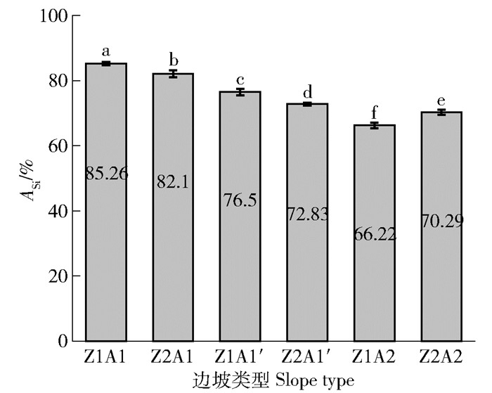 Z1A1:茶树边坡表层土样,Z2A1:茶树边坡亚表层土样,Z1A1′:原生植被边坡表层土样,Z2A1′:茶树边坡亚表层土样,Z1A2:素土边坡表层土样,Z2A2:素土边坡亚表层土样;a-f为显著性差异标记,不同标记字母即为差异显著。 Z1A1: Tea tree slope surface soil sample; Z2A1: tea tree slope subsurface soil sample; Z1A1′: native vegetation slope surface soil sample; Z2A1′: tea tree slope subsurface soil sample; Z1A2: plain soil slope surface soil sample; Z2A2: plain soil slope subsurface soil sample. a-f is a significant difference marker, and different marking letters are significant differences. ASi: Content of water-stable aggregates. 图 6 水稳性团聚体质量分数 Fig. 6 Contents of water-stable aggregates |