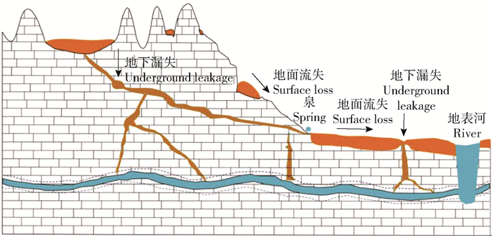1.2 水土漏失过程研究岩溶区水土漏失主要过程目前还存在学术观点分歧。张信宝等[12-13]认为岩溶地区土壤漏失是坡面产流产沙过程及向下伏岩溶裂隙的土壤蠕滑过程;唐益群等[14]认为是土壤从上覆土层向下伏岩层迁移的过程;冯腾等[15]认为是地表土壤渗漏到地下含水层的过程,且主要沿岩土软硬界面向地下漏失。从土壤漏失量角度考虑,越来越多的学者[16-20]认为岩溶区土壤以落水洞为重要漏失途径。虽然一些专家认为,岩溶山地的土壤漏失应限定为坡地土壤地下流失, 而进入沟道、洼地后的泥沙运移属于输移过程, 不应划为地下漏失[21]。学术观点可以讨论,但从水土漏失防治的重要性角度,如果不考虑落水洞水土漏失与地下河的水土输移过程, 就难以把握西南岩溶地区水土漏失与防治的重点及关键过程。而且,土壤剖面137Cs分布特征表明, 地表土壤随降雨沿裂隙向地下运移的侵蚀量较少[15, 22],局部地表的水土漏失研究难以解决西南石漠化区严重的耕地丧失、岩溶内涝和洞穴景观破坏等突出问题。李晋等[23]在落水洞被堵塞的小流域的研究表明,岩溶地区地下漏失量不足流域水土流失量的1%, 而云南南洞地下河流域的水土流失调查研究[24]表明,水土漏失量占流域水土流失量的91.58%。因此,水土漏失研究必须以岩溶流域为单元,系统研究包括地表、落水洞、地下河等在内的所有水土漏失关键过程(图 2[25])。这无论对于流域水土漏失理论和技术方法的建立,还是对于流域水土漏失防治均具有重要理论和现实意义[26]。