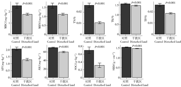 3 结果与分析 3.1 塔基建设对深层土壤物理化学性质的影响如图 1所示,通过对土壤物理化学性质进行显著性检验发现,塔基建设显著降低土壤密度、微生物量碳、微生物量氮、有机碳、总氮、总磷、总钾、有效磷和有效钾的质量分数(P<0.05)。