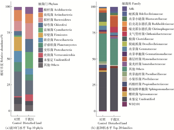 图 2 塔基建设干扰区和未干扰区深层土壤前10细菌门水平和前20科水平相对丰度 Fig. 2 Relative abundances of the top 10 phyla and the top 20 families in the bacterial communities of deep soil layers between in the disturbed area for transmission tower construction and undisturbed area |