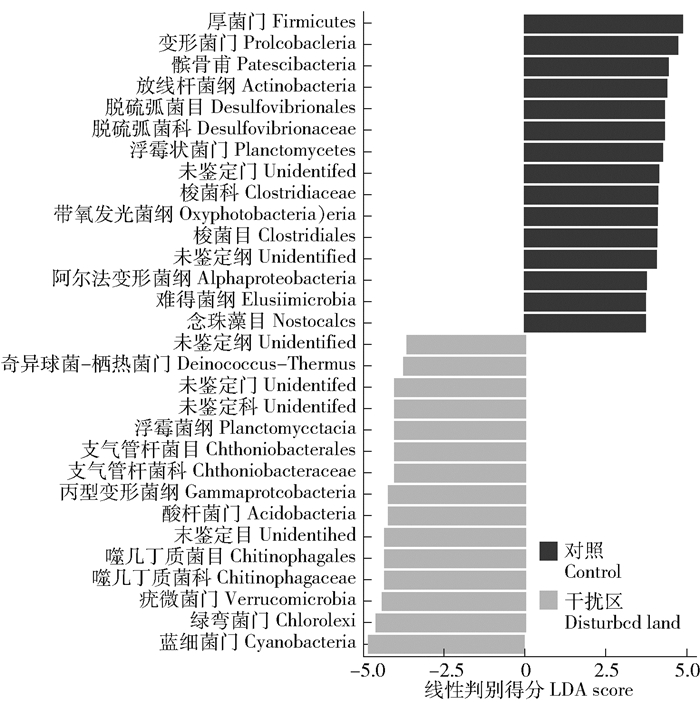 LDA为线性判别分。 LDA: Linear discriminant analysis. 图 3 基于LEfSe塔基建设干扰区和细菌物种差异分析 Fig. 3 Species difference analysis between in the disturbed area for transmission tower construction and undisturbed area based on LEfSe |