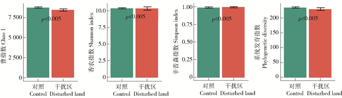 图 4 塔基建设干扰区和未干扰区深层土壤细菌α多样性差异 Fig. 4 Bacterial α-diversity difference of deep soil layers in the disturbed area for transmission tower construction and undisturbed area |