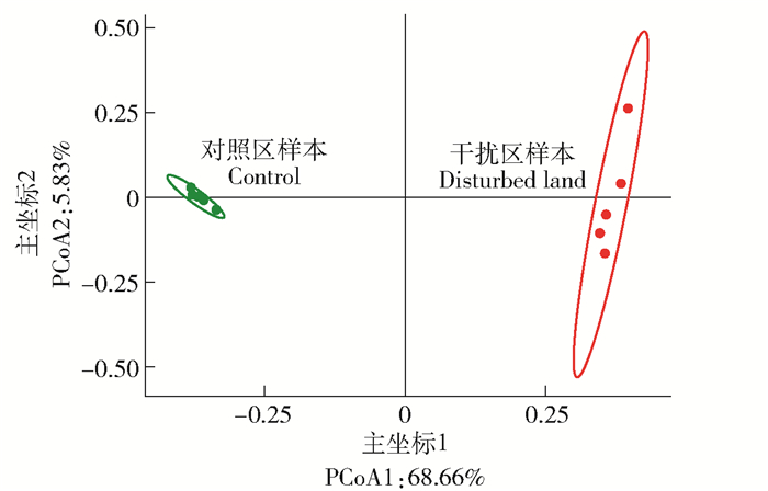PCoA(principal coordinates analysis)分析显示,塔基建设后深层土壤细菌群落结构显著不同。采用ANOSIM检验后发现,干扰区和未干扰区土壤细菌群落β多样性差异显著(R2=0.68, P=0.009)。由图 5显示,塔基建设导致深层土壤细菌群落组内差异的变异性显著增加。