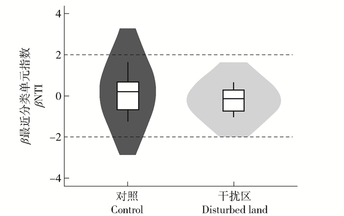 通过构建零模型,计算βNTI (beta nearest-taxon-index)量化细菌群落构建机制。结果发现,尽管未干扰区深层土壤细菌群落的构建受到21.1%的比例决定过程的影响,但塔基建设区深层土壤细菌群落的构建主要由随机过程影响(图 6)。而且,当塔基假设干扰后,深层土壤细菌群落构建100%受到随机过程的影响。显然,塔基建设增加了深层土壤细菌群落组装的随机性。