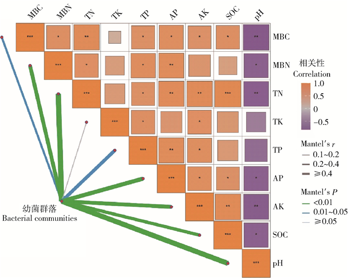 线条粗细代表Mantel的r值的大小。 图 7 细菌群落与土壤化学性质的Mantel相关性分析 Fig. 7 Mantel correlation analysis between bacterial community structure and soil chemical traits |