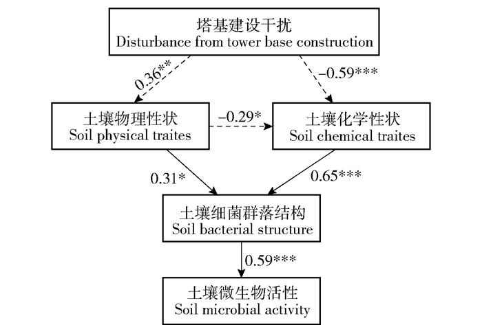 结构方程模型进一步验证,塔基建设直接改变土壤物理和化学性质,进而影响细菌群落多样性和结构(图 8)。塔基建设导致土壤结构的破坏和孔隙度的变化,可能引起水分保持能力、通透性等方面的变化。土壤侵蚀程度的增加直接导致有机质和养分的流失,pH、氮、磷等土壤化学性质改变又影响细菌群落的丰度、结构和构建方式。显然,工程施工对土壤环境的影响是多方面的,在生态修复过程中应该对受到影响的土壤提供更为精细的措施和细致的管理。