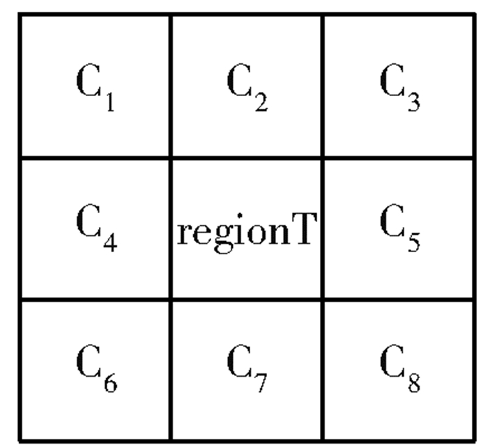 1) 在疑似生产建设项目图斑Ai的外围建立正方形中心区域regionT,并以regionT为中心、以regionT的3倍边长为新边长,建立九宫格缓冲分析区C1~C8(图 1)。