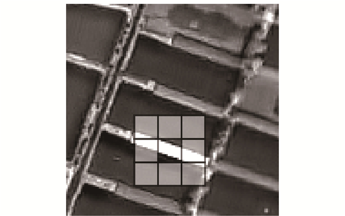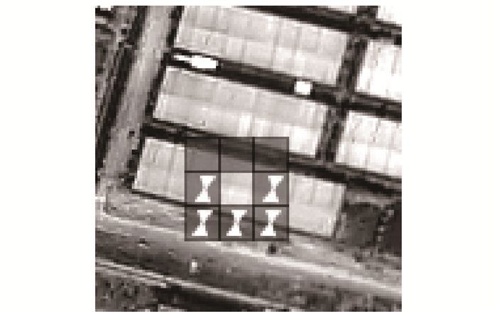 3) 根据二值化处理的结果以及Ci内的像元总数,计算出每个Ci内像元值为1的像元个数与像元总数的比值,记为Ti,并在模型中设置阈值β∈(0, 1),若Ti∈(β, 1)[14],则判定Ai为非生产建设项目图斑;若C1~C8内的Ti∈(β, 1)全部为假,则判定Ai为生产建设项目图斑。其中,β∈(0, 1)为模型参数,其取值决定模型对生产建设项目图斑识别的敏感程度,数值越小越倾向于将图斑识别为非生产建设项目,如图 2和图 3所示。