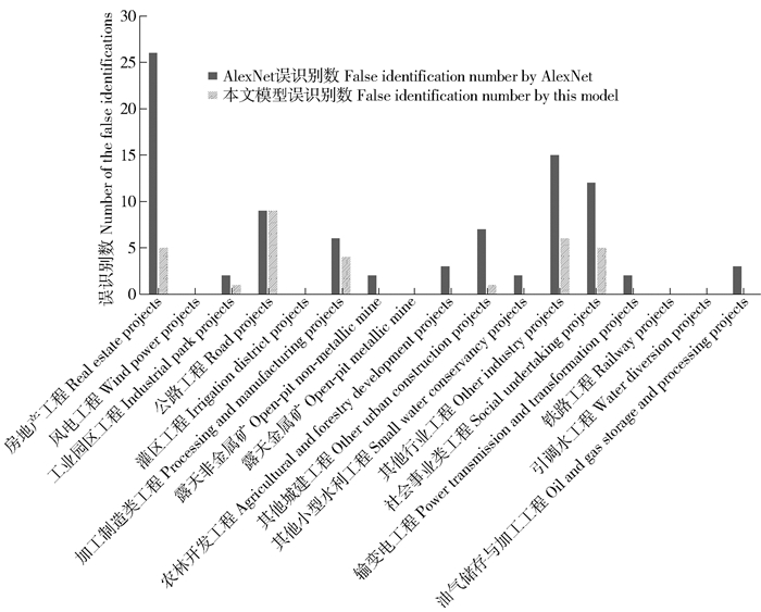 2.5 试验结果与分析利用本研究构建模型单一神经网络模型分别进行两组测试:在2021年GF-1号遥感卫星影像数据上进行自动识别勾绘,并使用同期经现场复核的图斑(即河南省2021年生产建设项目遥感监管现场核查成果)作为参考真实值,对2种模型自动识别的准确率进行对比分析。根据试验结果,使用本研究所述基于AlexNet卷积神经网络及遥感反演所构建的自动识别模型,在降低误识别率和漏识别率的效果方面均比单纯卷积神经网络识别模型优异,通过单一AlexNet与本研究构建模型计算结果误识别率的对比,剔除去2个模型误识别率都为0的地类,将二者求均值可以得出,本研究所构建的自动识别模型在各类地物的误识别率上平均降低23.88%,尤其在降低误识别率方面效果明显如图 7所示。表 3中列出的真实值,为2021年洛阳市经过现场核查确认的新增生产建设项目扰动数(263宗)。上表中的“命中数”为模型识别结果与真实值一致的数量,命中率为命中数与真实值之比;误识别数为模型将地物误识别为生产建设项目的数量,误识别率为误识别数与真实值之比;漏识别数为模型没有正确将地物误识别为生产建设项目的数量,漏识别率为漏识别数与真实值之比。真实值等于命中数与漏识别数之和。