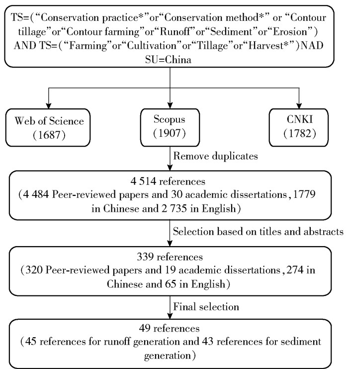 We conducted a review of literature from the electronic journal databases Web of Science, Scopus, and China National Knowledge Infrastructure (CNKI) to reduce publication bias. The following search terms were used: "Conservation practice" or "Conservation method", "Contour tillage" or "Contour farming", "Runoff" or "Sediment" or "Erosion", and "China" (Fig. 1). We selected the literature based on the following criteria: 1) test-plots were observed under natural or simulated precipitation conditions and exposed to the same topography; 2) either runoff or soil loss was included in the publications; 3) the number of replications, mean values, standard deviations or standard errors of plots with different ESWCMs were reported; 4) at least one of the factors was recorded associated with plots, such as location, precipitation, slope gradient, and ESWCMs; and 5) more than two data pairs were contained in each group.
