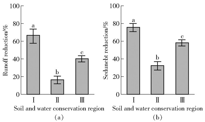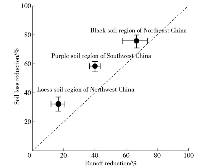 Due to the differences in climate and topography, the reduction differed across regions concerning both runoff and sediment (Fig. 7). The ESWCMs applied in the black soil region of Northeast China (75.8% for sediment reduction and 66.6% for runoff reduction) and purple soil region of Southwest China (58.3% for sediment reduction and 40.0% for runoff reduction) was more effective in reducing sediment and runoff than that those in the loess soil region of Northwest China (43.4% for sediment reduction and 16.4% for runoff reduction), which may be since topography, climate and soil properties were more suitable to apply ESWCMs to conserve water and soil. The ESWCMs plotted along the 1 ∶1 line indicated that soil loss reduction was stronger than runoff reduction.