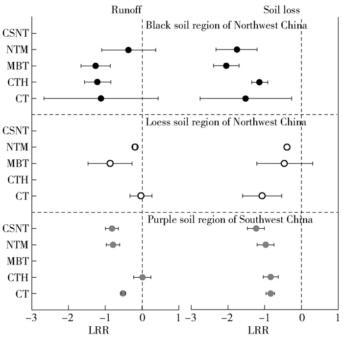 NTM relatively had a certain efficiency in the loess soil region of Northwest China on runoff and sediment reduction (17.3% and 32.5%) (Fig. 3). However, MBT was not recognized as the effective measures for reducing sediment because the value of its LRR was across 0. The possible reason was that MBT controlled water erosion by changing the microtopography with intense tillage operation, leading to a great soil detachment. CT (LRR = -1.06) in this region was slightly better than MBT (LRR = -0.45) and showed the best performance in sediment reduction (Fig. 3). However, ESWCMs were ineffective in controlling runoff and soil loss in the loess soil region of Northwest China. Therefore, terraces and fish-scale pits were always used to reduce water and soil loss in this region.