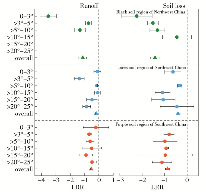 The effects on runoff and soil loss for 0-3° in the black soil region of Northeast China were the most obvious, which may be easy to control runoff and sediment due to the gentle slope, little runoff, and sediment generation. The effect of >3°-5° on runoff reduction in the loess soil region of Northwest China was the most obvious, but the reason was not clear. In the purple soil region of Southwest China, the benefit of 3°-10° on reducing runoff and soil loss was significant, which may be due to the interaction of slope and precipitation.