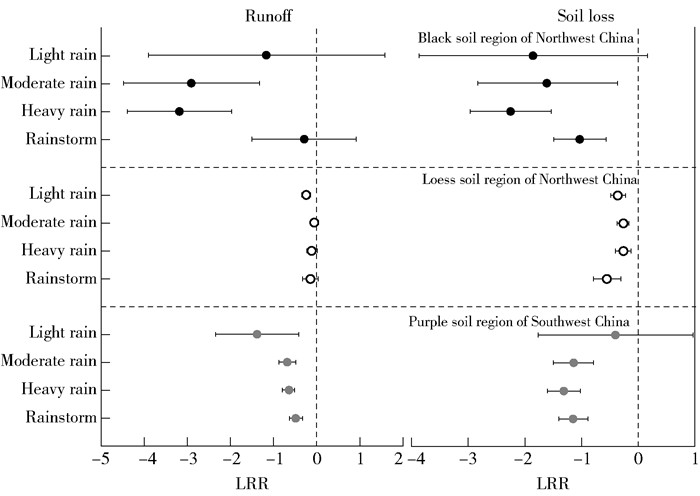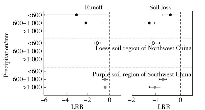 The annual precipitation reflected the overall local climate. Due to different climatic conditions, the annual precipitation was various. The annual precipitation of investigated black soil region of Northeast China, loess soil region of Northwest China, purple soil region of Southwest China was mainly < 600 mm, 600- < 1 000 mm, and ≥1 000 mm, respectively, which were consistent with the actual annual precipitation in the three regions (Fig. 6). Under the annual precipitation, the LRRs of ESWCMs were < 0, which indicated that ESWCMs were effective on soil and water conservation in the three regions. Under the condition of different annual precipitation, ESWCMs on runoff control showed more effective and larger variability in the black soil region of Northeast China than the other two regions.